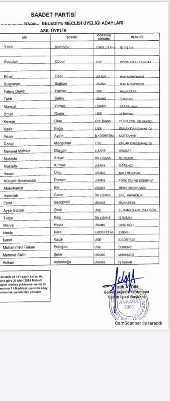 Saadet Partisi’nin Pendik Belediye Meclis Üyesi Listesi Şu İsimlerden Oluştu: